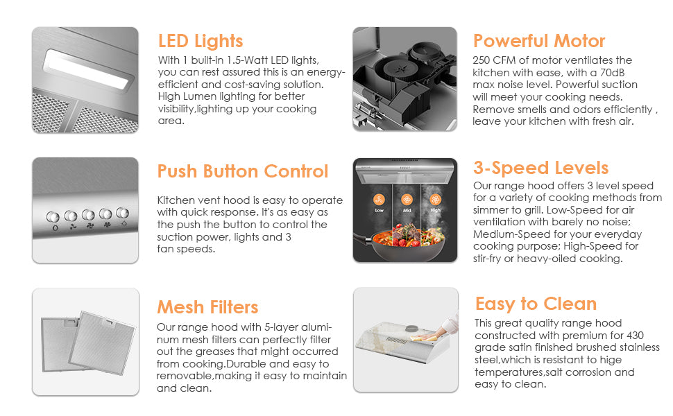 - 【ENERGY-EFFICIENT LIGHTS】--The energy-efficient, 1.5-watt LEDs are long-lasting and provide the range hood with bright, high lumen lighting for better visibility at night.