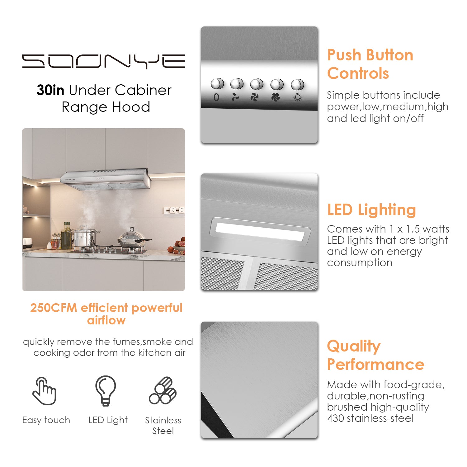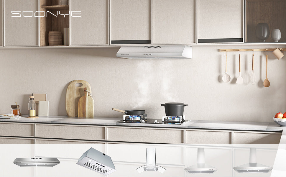 SOONYE 30 inch Stainless Steel Under Cabinet Range Hood, Slim Kitchen Vent Hood Ducted/Ductless Convertible with 3 Speed Controls, 5-Layer Aluminum Filters,LED Lights