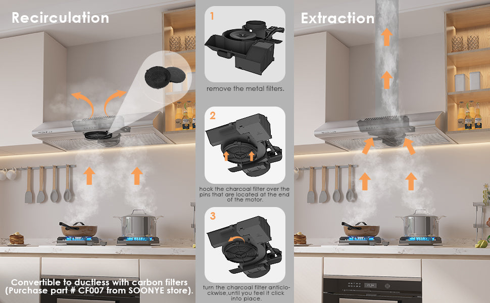- 【3-Speed Efficient Airflow】--The 30-inch wall-mounted range hood is equipped with a powerful motor, has 3 different speeds, and the maximum airflow is 250CFM, which can quickly remove the cooking fumes and harmful substances, thereby reducing the damage to the skin and health.Converts to ductless range hood with Carbon Filter Kit Purchase Part # CF007 (Sold Separately)