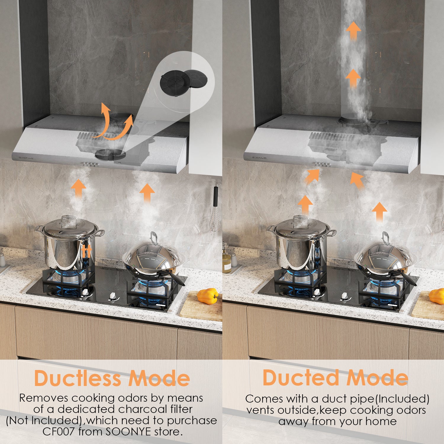 I like the ductless option in this range hood since I donᄀᆵt have to do any drilling. The ductless option does remove fumes, and smoke but cooking odor still lingers. The most inconvenient thing is you have to get their dedicated charcoal filter (not included) at their store. Other than that, itᄀᆵs a nice range hood. The LED lighting is bright. The air from vent blows upward away from the face. Installation was not that easy.
