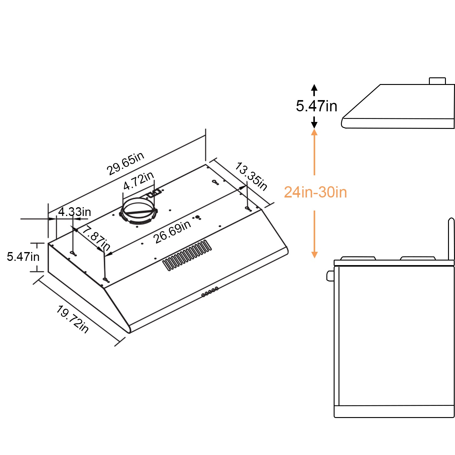 - 【Dimensions】 --Range Hood Product Dimensions: 20 in. (D) x 30 in. (W) x 5.5 in. (H). Electrical: 120V/60Hz, 3-prong plug. Duct Size: 4.72in.